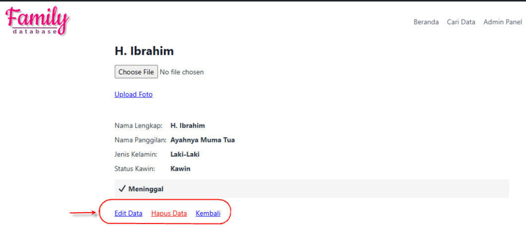 - Jika mempunyai hak untuk mengedit data yang bersangkutan, akan muncul tombol Hapus / Upload Foto dan link “Edit Data”.