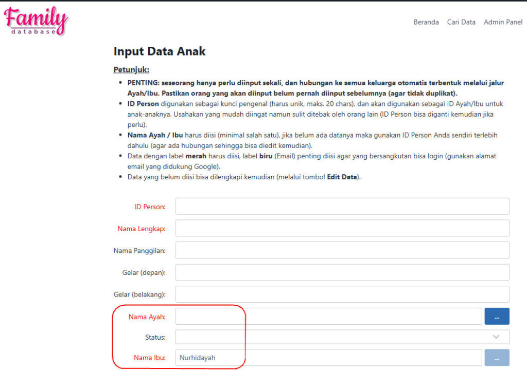 - Nama ayah dan ibu bisa diisi/ diganti menggunakan tombol di sebelah kanan. Pencarian data ayah dan ibu menggunakan ID Person, sehingga anda perlu mendapatkan ID Person ayah dan ibu (yang persis) terlebih dahulu. Jika data ayah dan ibu belum dimasukkan, maka data tersebut harus dimasukkan terlebih dahulu (pada MENU > Tambah Data).