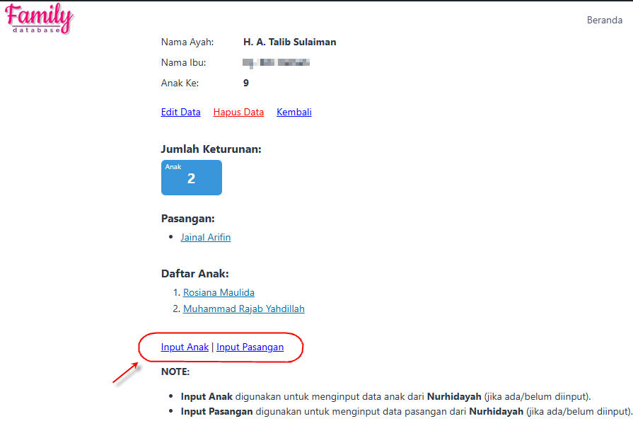 - Tampilkan (View Data) person yang ingin ditambahkan data anak atau pasangannya.